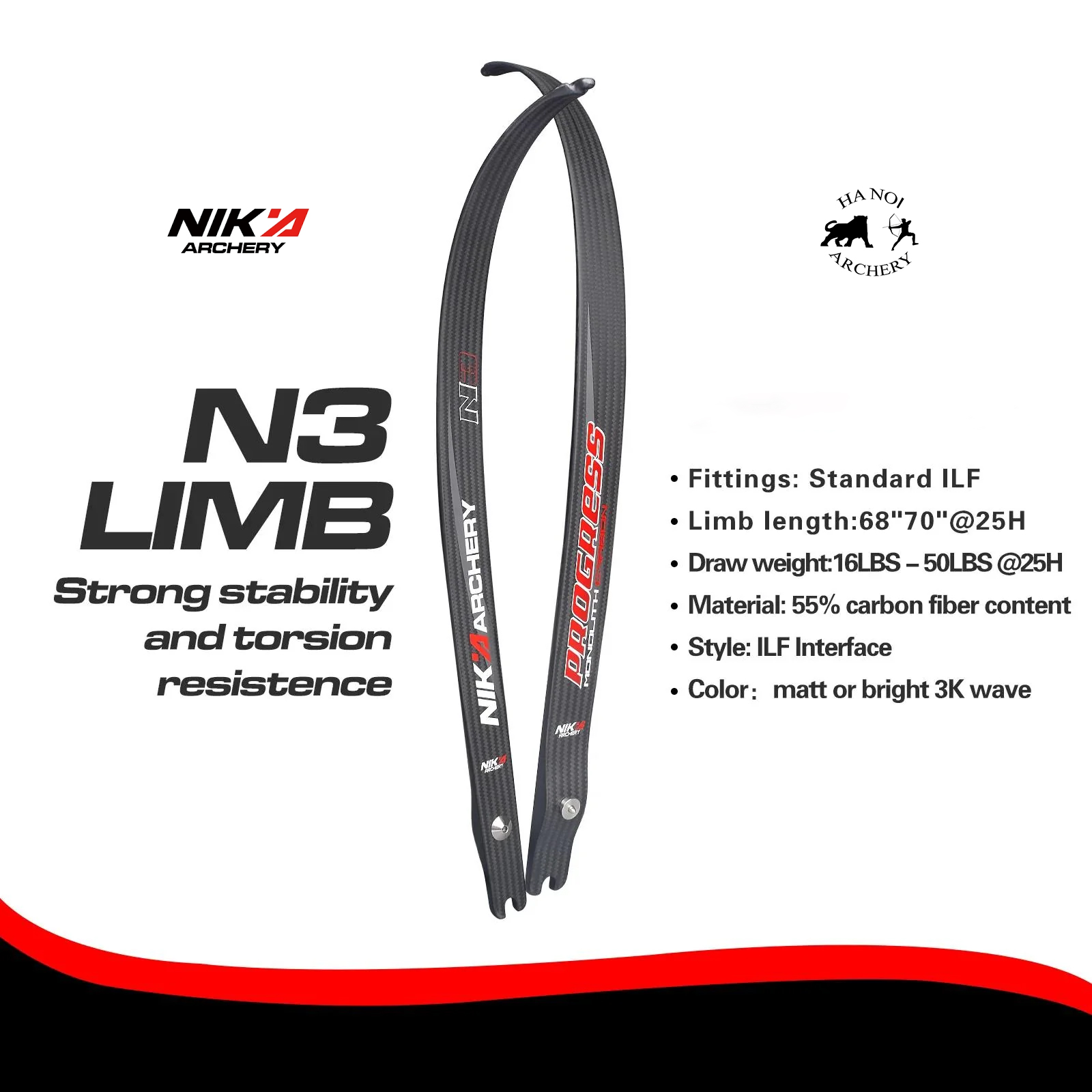 Cánh cung Nika Archery Progress N3 Carbon Fiber Limbs là lựa chọn hàng đầu cho các cung thủ mong muốn sự tốc độ, ổn định và bền bỉ.